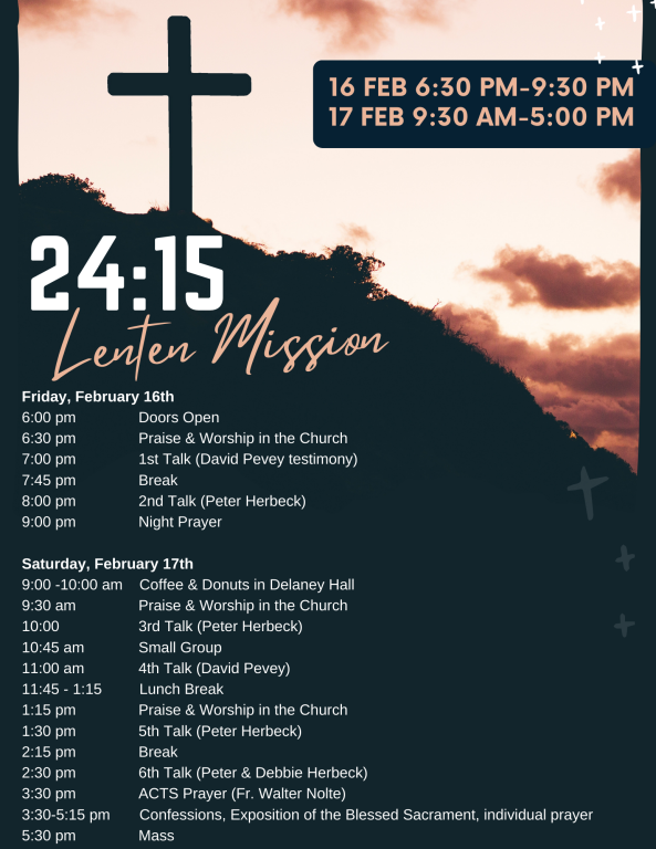 Living ordinary lives in extraordinary ways is the theme for our 2024 Lenten Mission! Join us for this free 2-day retreat featuring a witness from evangelist David Pevey, as well as talks from Peter & Debbie Herbeck with Renewal Ministries. Learn how to live out your faith with love and mercy in your family and community. Snacks provided. Full schedule below.