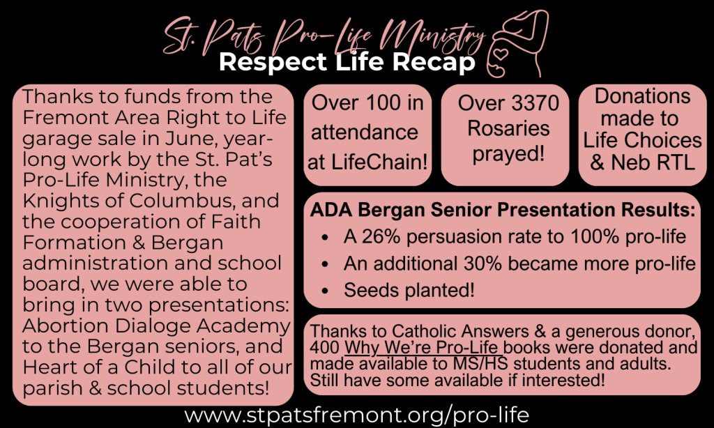 Want to get involved with St. Pats Pro-Life Ministry? Contact Crystal Sixta at 402-525-4615 or crystalsixta@gmail.com.