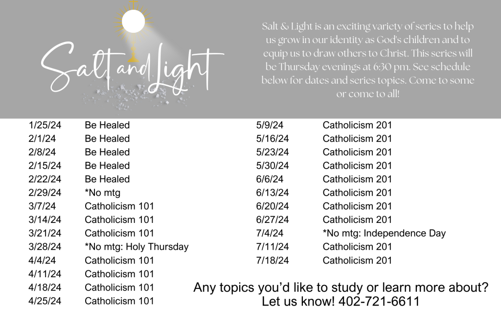 Salt & Light is a new exciting variety of series to help us grow in our identity as God's children and to equip us to draw others to Christ. This series will be Thursday evenings at 6:30 pm. See the schedule below for dates/topics. Come to some or come to all!